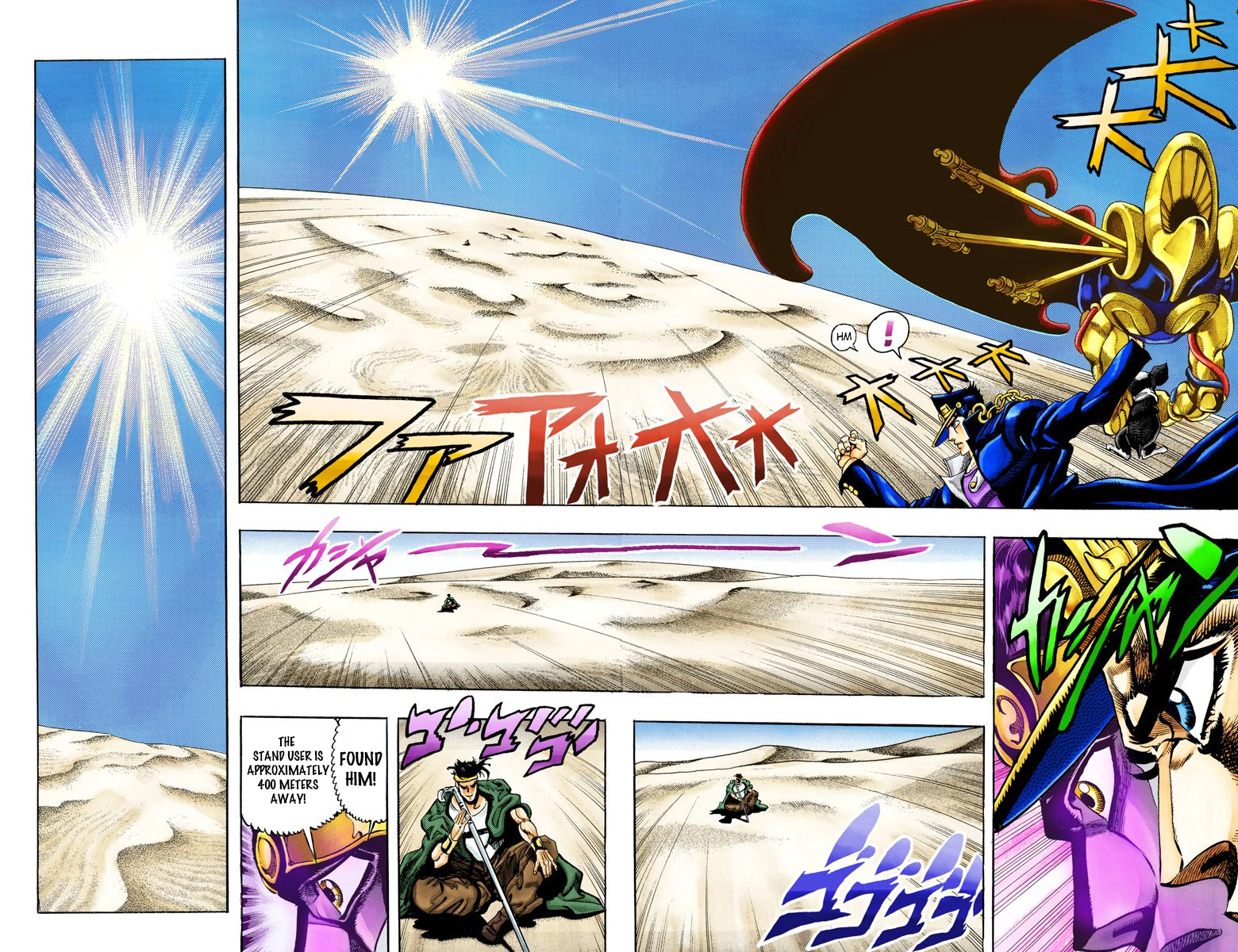 Jotaro ran 400 meters on foot in about 25 seconds (or 16 m/s)